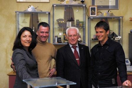 Im Jahre 1978 also vor genau 31 Jahren eröffnete ich die Goldschmiede in der Schiffstraße 7 in Freiburg – eben jenes Geschäft außerhalb… Auf 37 Quadratmetern wird hier gelebt, wonach sich manch anderer sehnt: Beruf als Berufung. Wir machen tragbaren Schmuck, mit dem der Kunde sich identifizieren kann. So einfach ist das und so schwierig zugleich, denn diese individuelle Beratung erfordert Zeit und Liebe zur Sache. Beides ist gegeben: Mein Sohn Stefan steht mir seit 1985 zur Seite, hat 1995 die Meisterprüfung abgelegt und noch ein Studium als Betriebswirt des Handwerks absolviert. Mein Sohn Thomas hat ebenfalls eine Goldschmiedelehre im väterlichen Betrieb abgeschlossen und kümmert sich um die Internet-Präsentation unseres Familienbetriebes. Hier ein Foto von Lechler und Söhne (und Schwiegertochter) – von rechts nach links: Thomas Lechler, Dieter Lechler, Stefan Lechler und unsere Schwiegertochter Corina.
