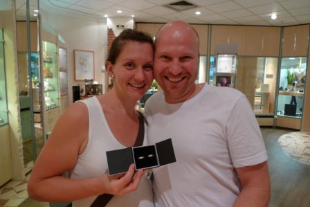 Vor kurzem bekamen wir eine Mail, über die wir uns sehr gefreut haben. Und zwar von unseren Kunden Nicole und Dirk Zimmermann. Die beiden haben am 24. Juni 2011 standesamtlich geheiratet. Ihre Trauringe von der Firma Fischer hatten sie sich bei uns ausgesucht. Die Eheringe wurden aus 950/- Palladium gefertigt, der Damenring mit zwölf Brillanten besetzt. Als das Brautpaar die Trauringe bei uns im Solitaire abholte, machte ich noch schnell ein Foto – bei genauerem Hinsehen kann man erkennen, dass die beiden im Grunde nicht allein waren, als sie ihre Ringe abholten.
