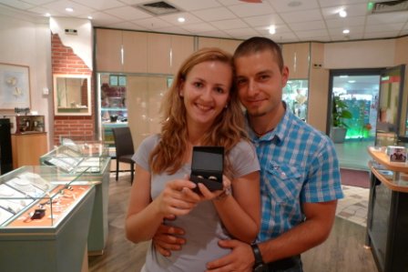 Gestern erst hat man mir zum Geburtstag hier im Blog ganz viel Freude und Glück gewünscht. Vielen Dank auch an dieser Stelle dafür! Heute kann ich auch einen Beitrag mit „Freude und Glück“ betiteln, denn junges Eheglück strahlt einfach immer wieder sichtbar Freude aus. Heute dürfen wir euch wieder einmal Bilder eines frisch vermählten Paares zeigen. Unsere Kunden Heiko und Vika schickten uns ein paar fotografische Eindrücke von ihrem schönsten Tag. Wunderschöne Bilder! Vielen Dank dafür! Aber auch schon beim Kauf der Trauringe bei uns im Solitaire hatten wir bereits ein Foto von dem jungen, hübschen und sichtbar verliebten Paar gemacht: