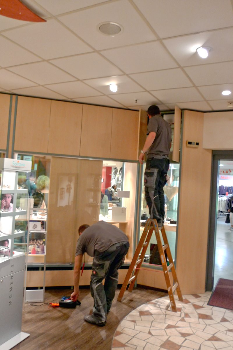 Vielleicht ist dem ein oder anderen vorhin bei unserem Beitrag über die TeNo Vorlage die Leiter im Foto aufgefallen. Dieses Bild-Motiv deutet ja bereits darauf hin, wir hatten am TeNo Vorlage-Tag die Handwerker im Haus. Der Grund: Wir waren ohne Beleuchtung in den Fenstern, denn offenbar hatte es in der Elektrik fürs Schaufensterlicht einen Kurzschluss gegeben. Die komplette Beleuchtung war ausgefallen. Die Handwerker suchten nach dem Fehler und überprüften an dem Vormittag, als Christel da war, die Stromleitungen. Drei Stunden lang waren ein Geselle und ein Lehrling damit beschäftigt, die Ursache zu finden – zum Glück dann nach so intensiver Suche schlussendlich mit Erfolg. :-))
