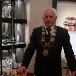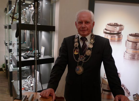 Am Wochenende hat Dieter den „Goldenen Meisterbrief“ überreicht bekommen und das war sogar schon fünf Jahre überfällig! :-) Und nach der eigenen Auszeichnung hat er selbst dann auch als Innungsobermeister der Goldschmiede-Innung Freiburg-Südbaden das Vergnügen einem anderen, für ihn unbekannten Goldschmiedemeister einen goldenen Meisterbrief zu übergeben. Die feierliche Veranstaltung fand hier in Freiburg in der Gewerbeakademie statt. Ich konnte leider nicht dabei sein, denn ich musste im Geschäft bleiben, weil einige Kunden Beratungstermine gemacht hatten und sich angekündigt hatten. Deshalb gibt es auch von der Veranstaltung selbst keine Fotos, aber natürlich hab ich vom Innungsmeister Dieter mit Obermeisterkette noch schnell ein Bild gemacht, bevor er gegangen ist.