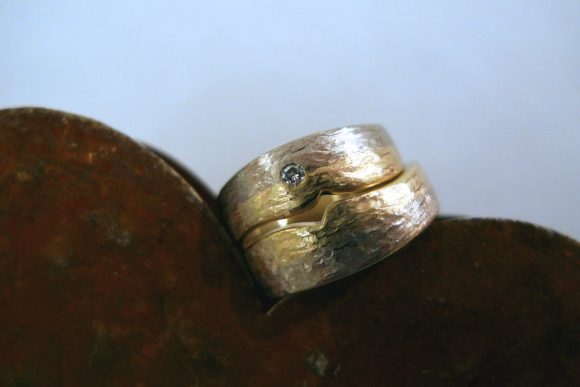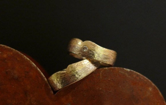 Heute zeige ich euch mal Dieters Tagewerk von gestern. Ganz frisch aus der Goldschmiede kommen zwei Trauringpaare. Das Bild links zeigt Trauringe aus hochwertigem Gelbgold mit Handstruktur. Diese Ringe sind quasi noch lauwarm. :-) Lauwarm sind auch die Eheringe noch, die ihr zu sehen bekommt, wenn ihr auf Weiterlesen klickt. Sie sind aus Weiß- und Gelbgold gefertigt worden. Der Damenring ist mit drei Brillanten besetzt und interpretiert das Herz-Symbol auf dezente Weise… Nun werdet ihr euch vielleicht fragen, wieso denn drei Brillanten, da ist doch nur einer zu sehen?
