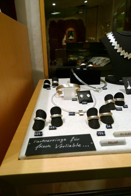 Schaufensterdeko ist wichtig, damit die Leute auch stehen bleiben und schauen. Aber manchmal wundere ich mich, wie wenig es denn doch braucht, um Aufmerksamkeit zu erzielen. Ich hab am vergangenen Samstag einfach mal ein kleines Hinweisschild zu den Freundschaftsringen ins Schaufenster gelegt. Seitdem bleiben deutlich mehr Pärchen stehen und betrachten schmunzelnd die Ringe.