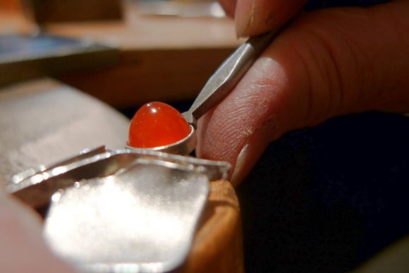 *Empfindliche Steine wie z. B. Opal oder Lapislazuli würde man eher mit einem Kupfer- oder Messingpunzen einfassen. Ein Punzen ist so etwas wie ein massiver Vierkantmetallstift. Und wird sicher dann unter P wie Punzen demnächst hier in unserem neuenGoldschmiede-Lexikon zu finden sein. :-)